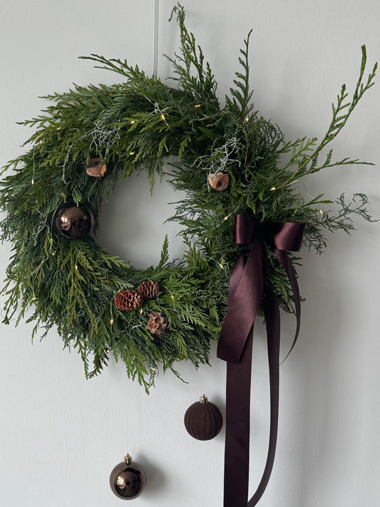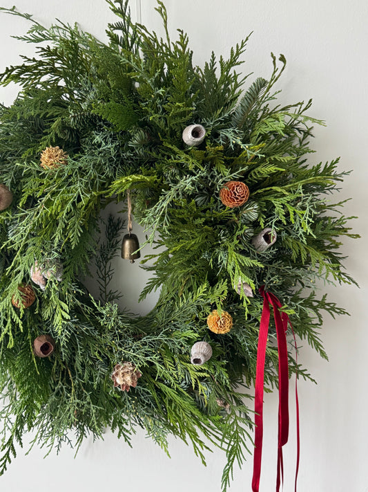 Our seasonal wreaths are created to highlight the natural form and texture of the materials we use. Each design in this collection has its own personality—some airy, some full, some sculptural—reflecting the character of the foliage and botanicals of the season. Every wreath is made by hand, so no two pieces are ever the same.