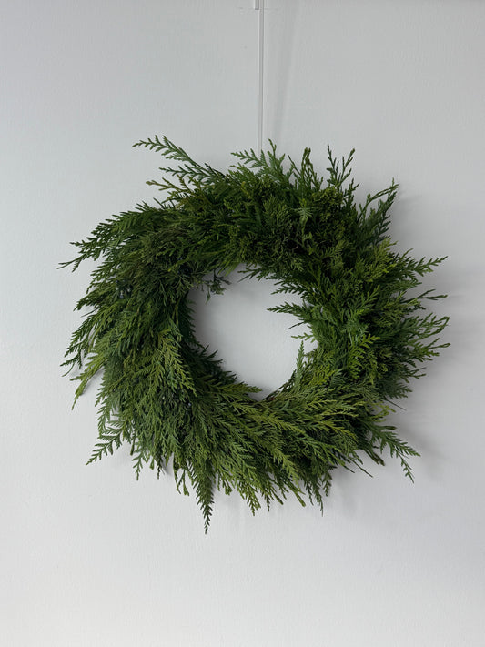 To care for your wreath, place it in a cool, shaded, and protected area, keeping it away from direct heat or strong sunlight. Fresh greenery styles may be lightly misted to help maintain their color and texture.