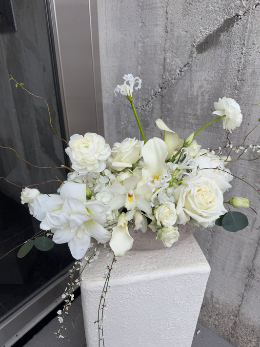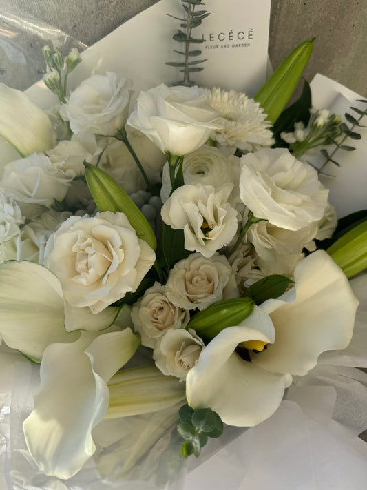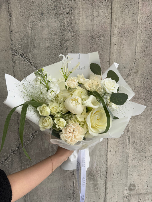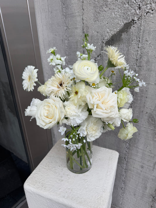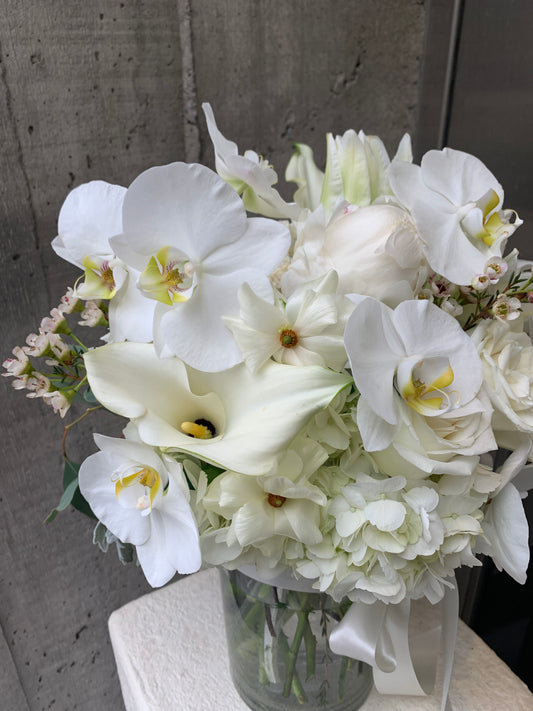 The main color of this arrangement is an elegant white, making it perfect for any occasion. Each bouquet is carefully handcrafted with fresh, seasonal flowers, ensuring the highest quality and beauty. You can never go wrong with white.