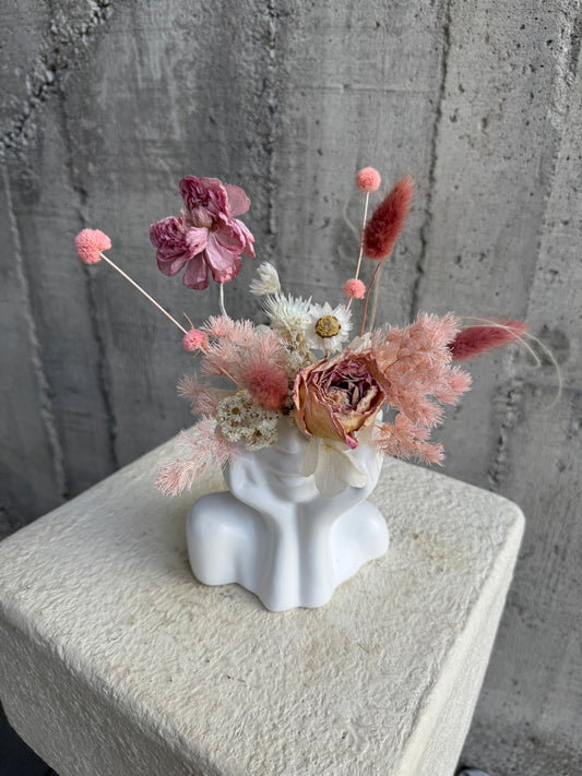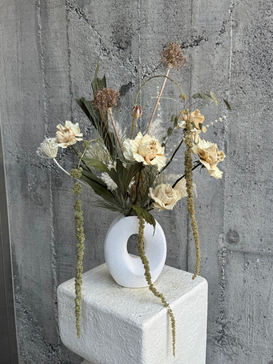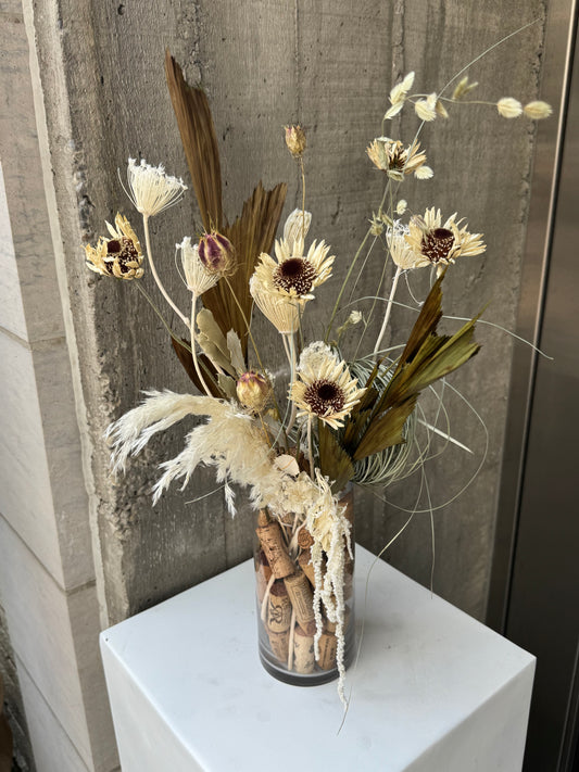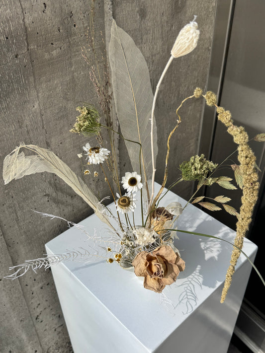 Our dried flowers are thoughtfully crafted using a blend of fresh and dried ingredients, ensuring lasting beauty forever. With only one-of-a-kind designs, no two arrangements are ever the same, adding a personalized touch to your space. The majority of our dried ingredients are carefully hand-selected and hung to dry in our store, preserving the charm of seasonal flowers, grasses, and foliage. This thoughtful process allows us to offer you timeless pieces that can be enjoyed year-round.
