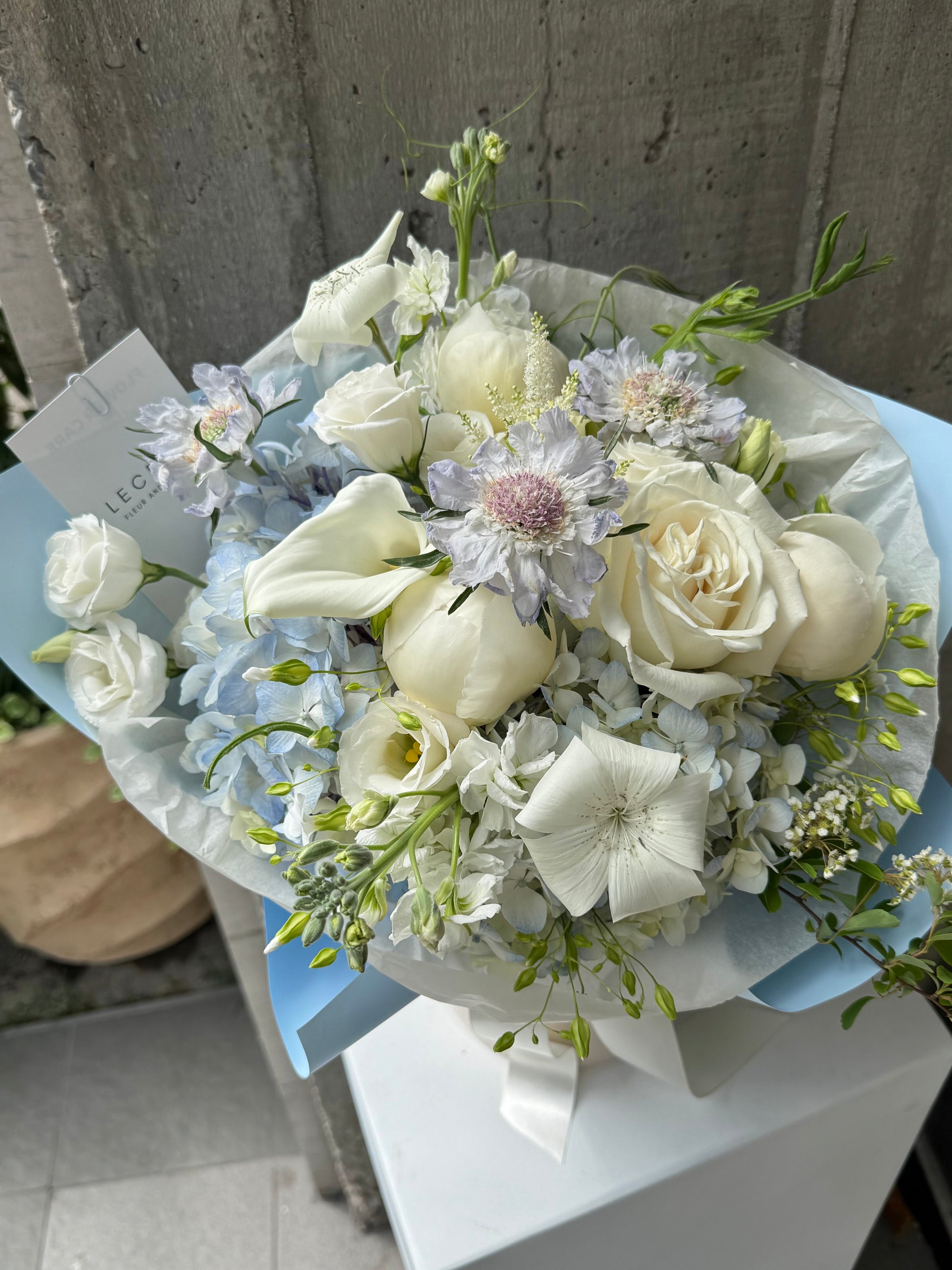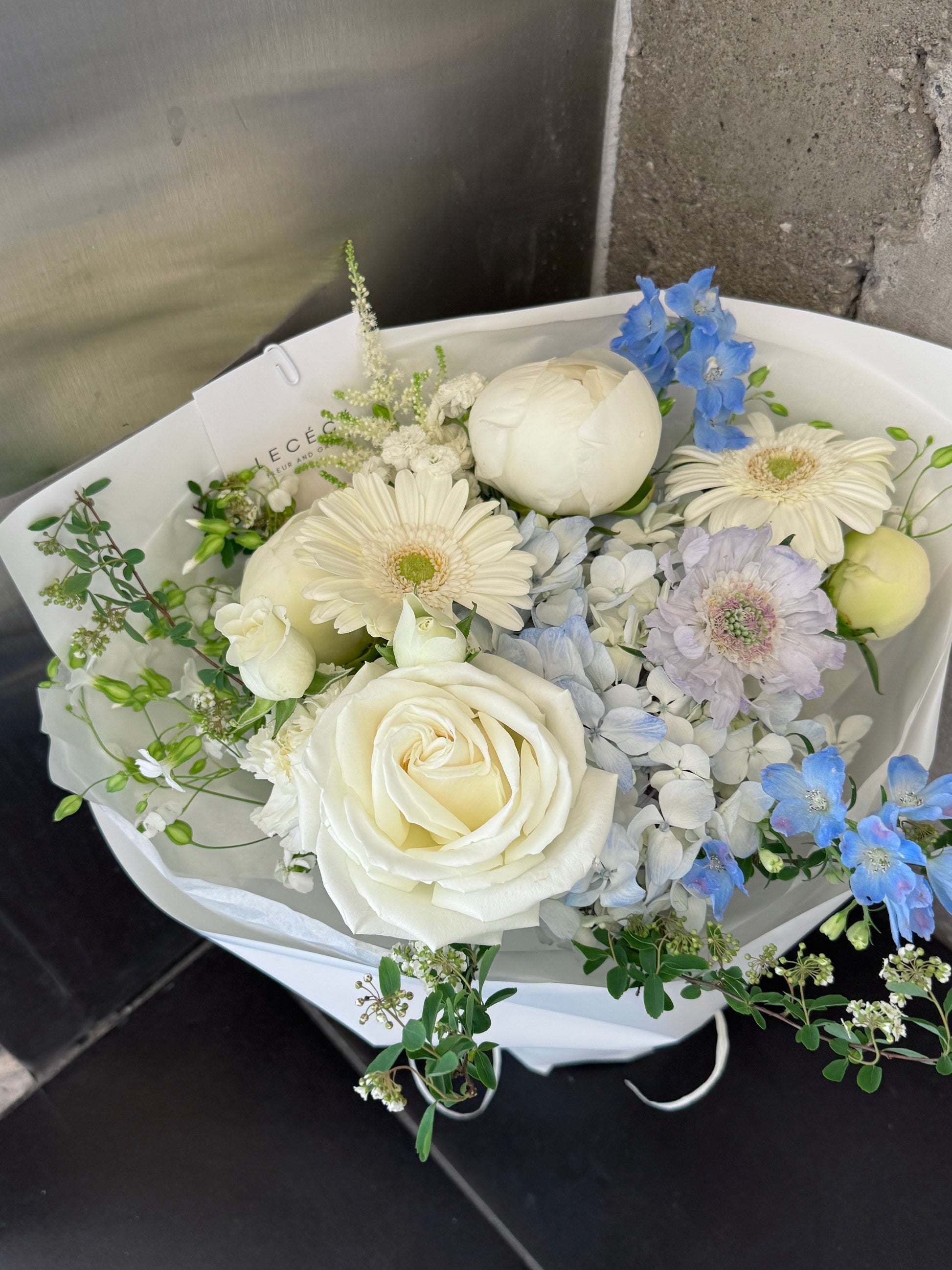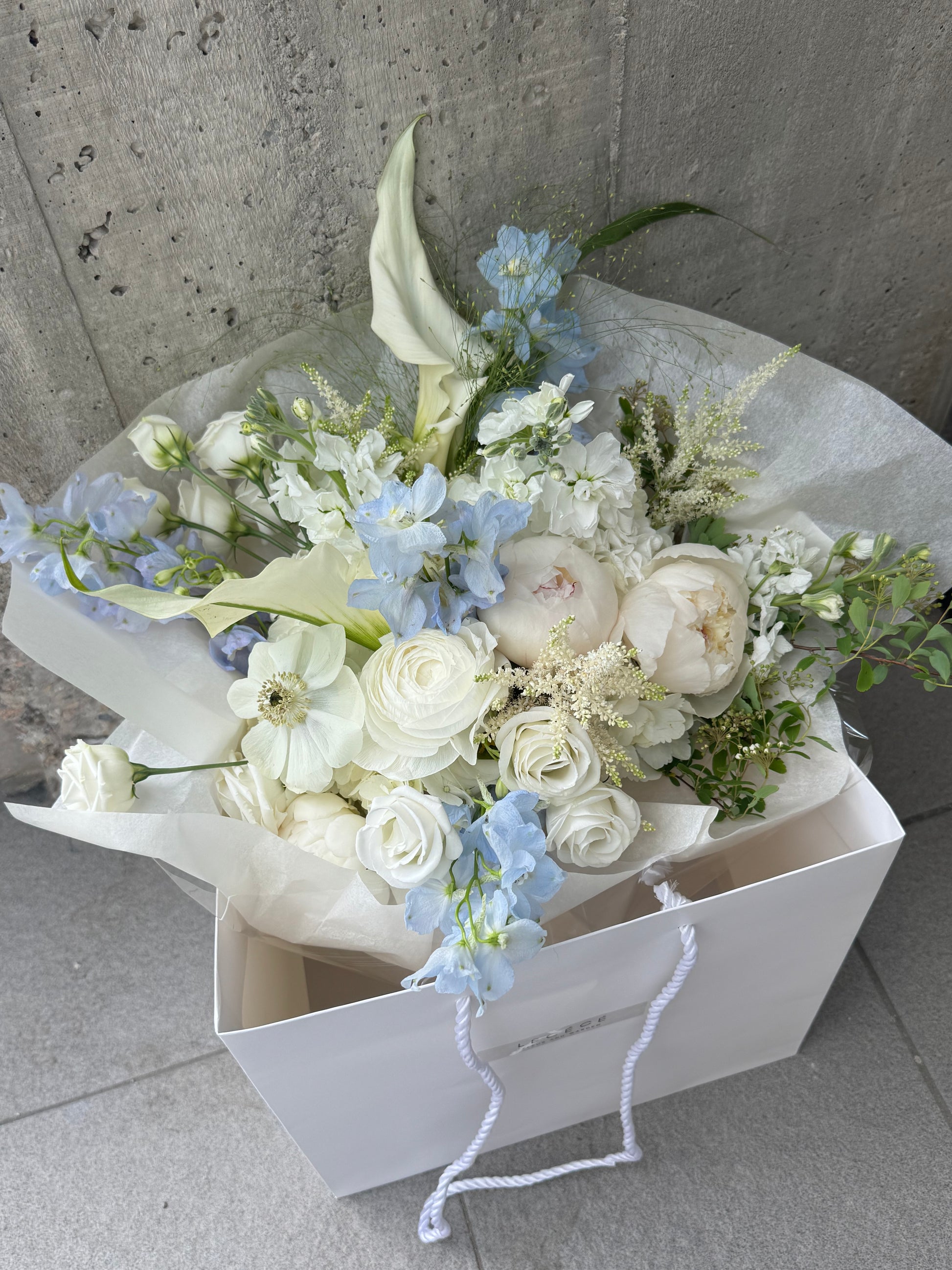 Inspired by the calm of the sky, this dreamy bouquet in soft whites and pale blues captures the lightness of a gentle cloud. Thoughtfully composed with seasonal flowers.