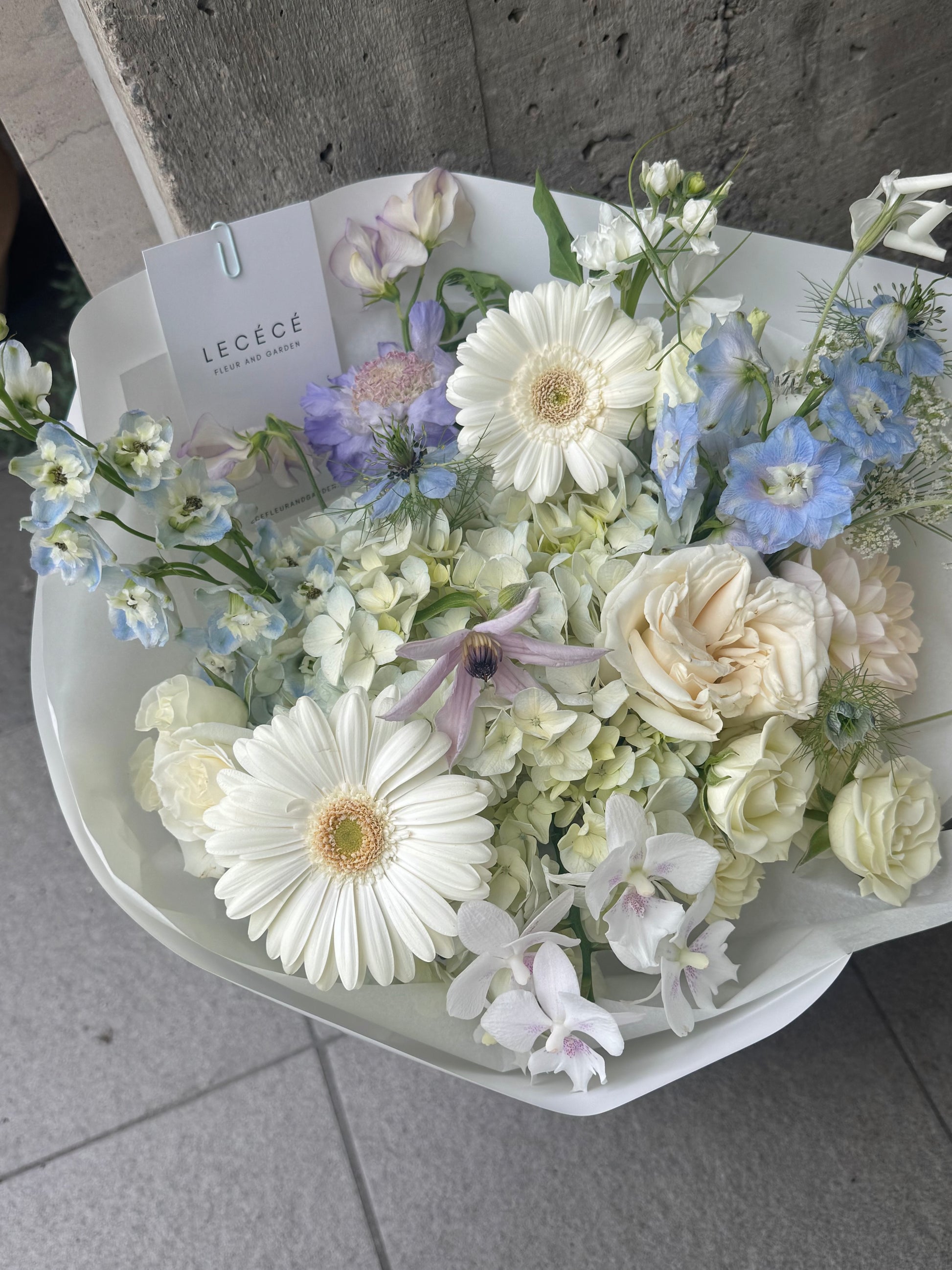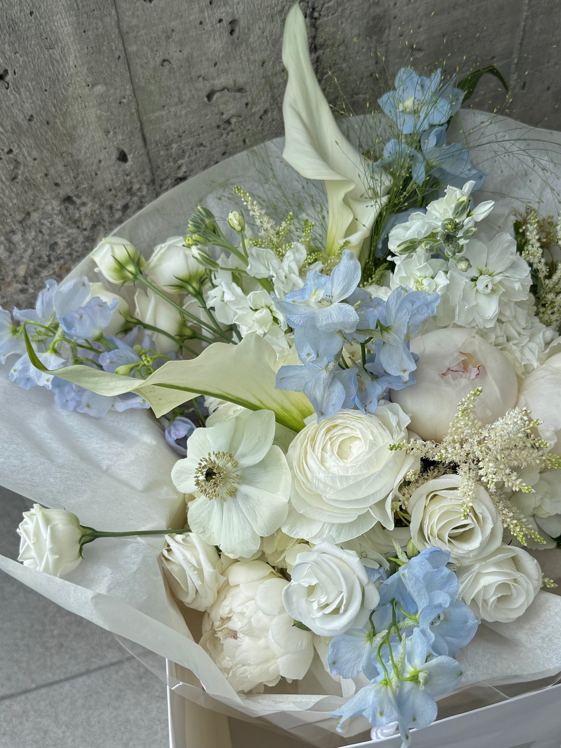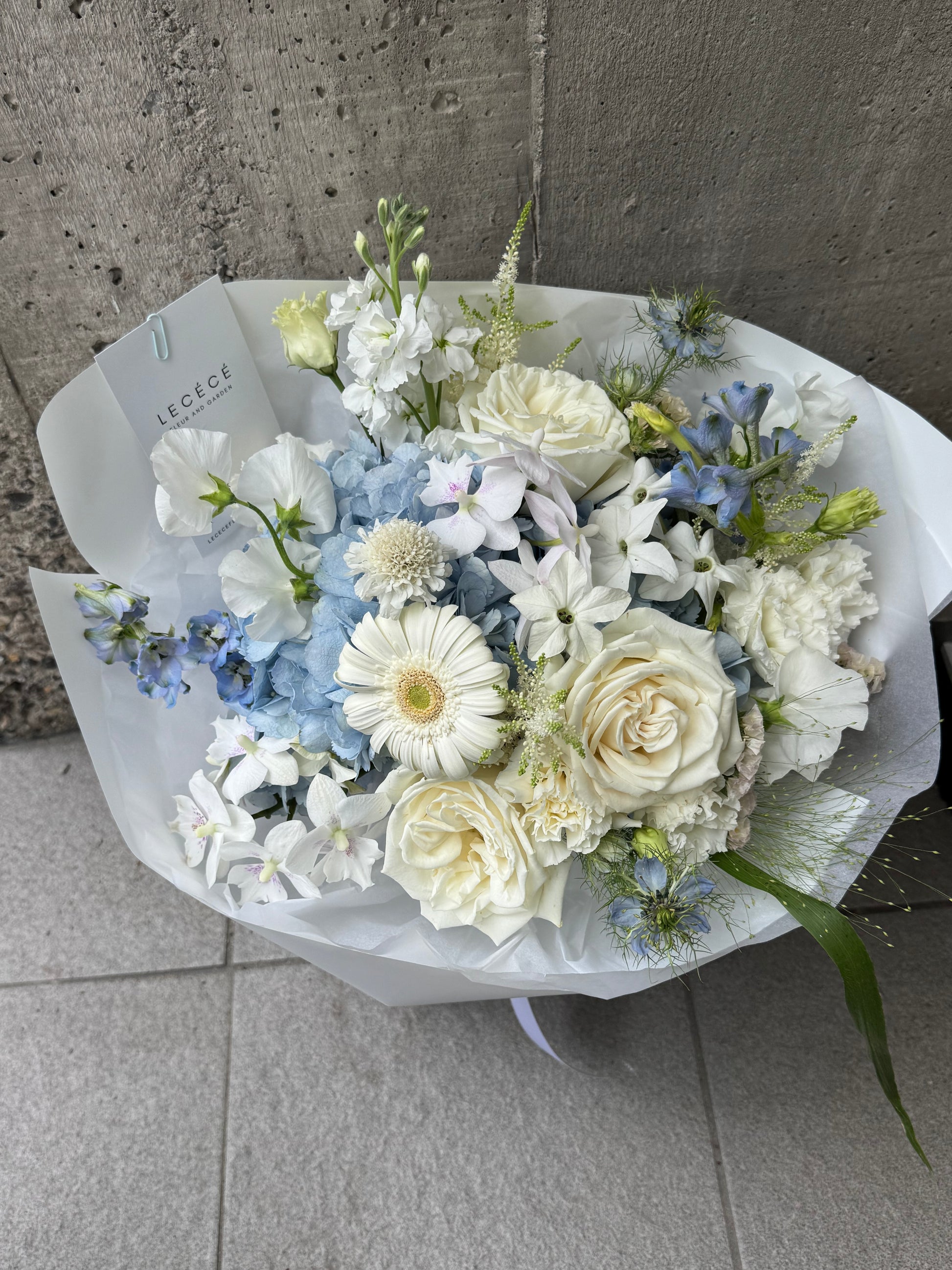 Inspired by the calm of the sky, this dreamy bouquet in soft whites and pale blues captures the lightness of a gentle cloud. Thoughtfully composed with seasonal flowers.