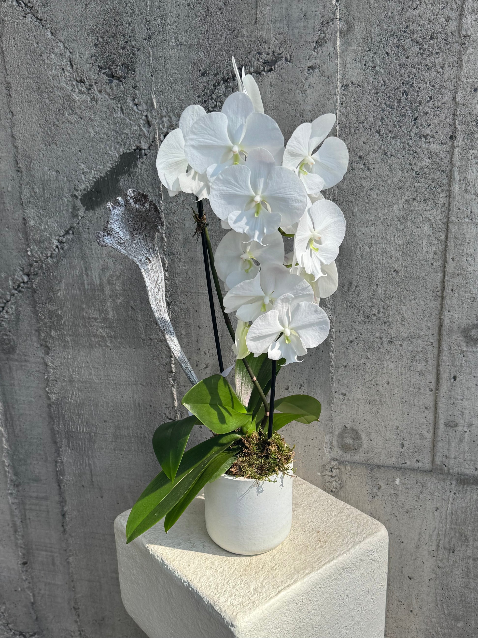 This orchid arrangement features a single stem in a cascading style, carefully designed with attention to detail.