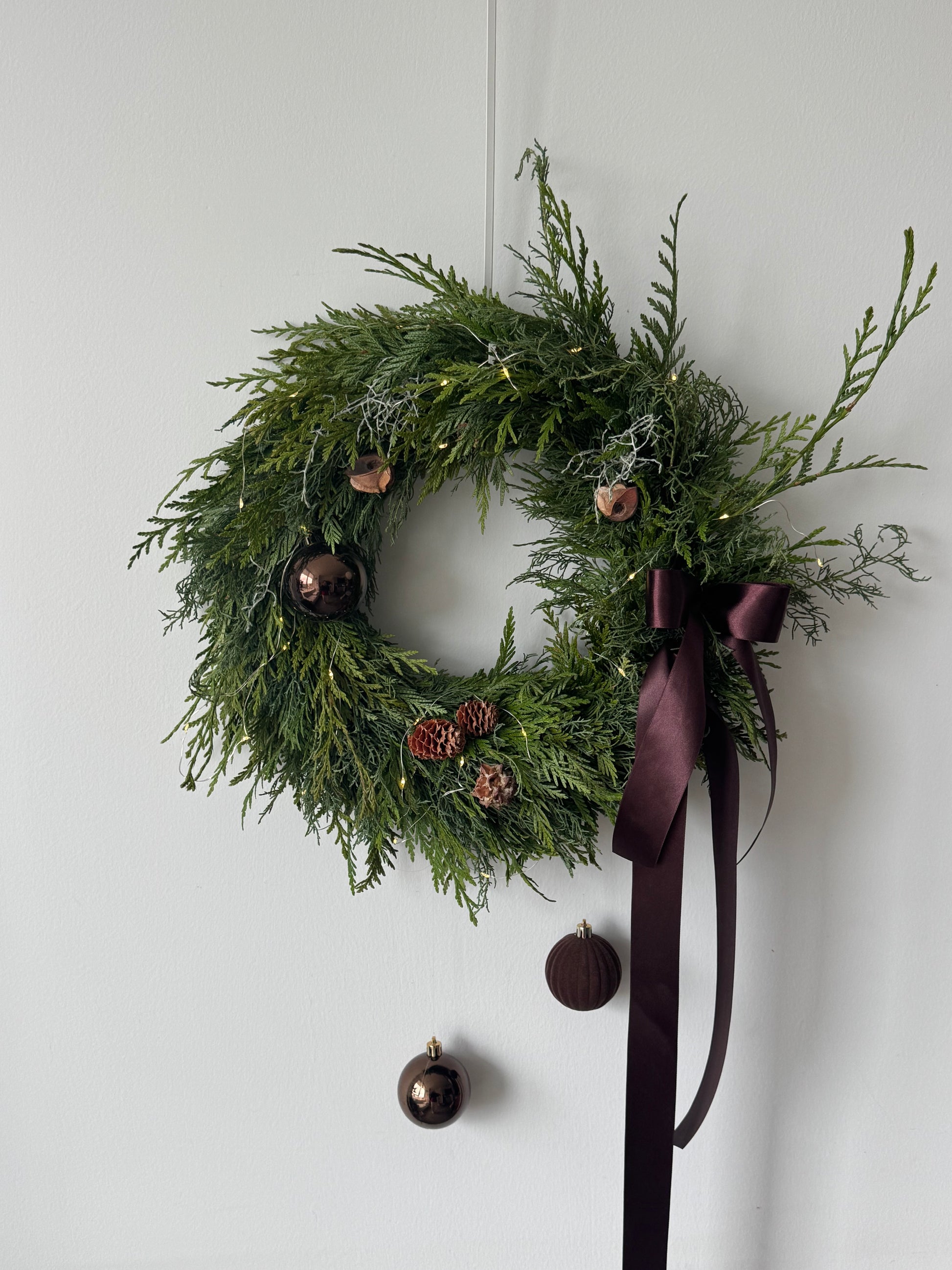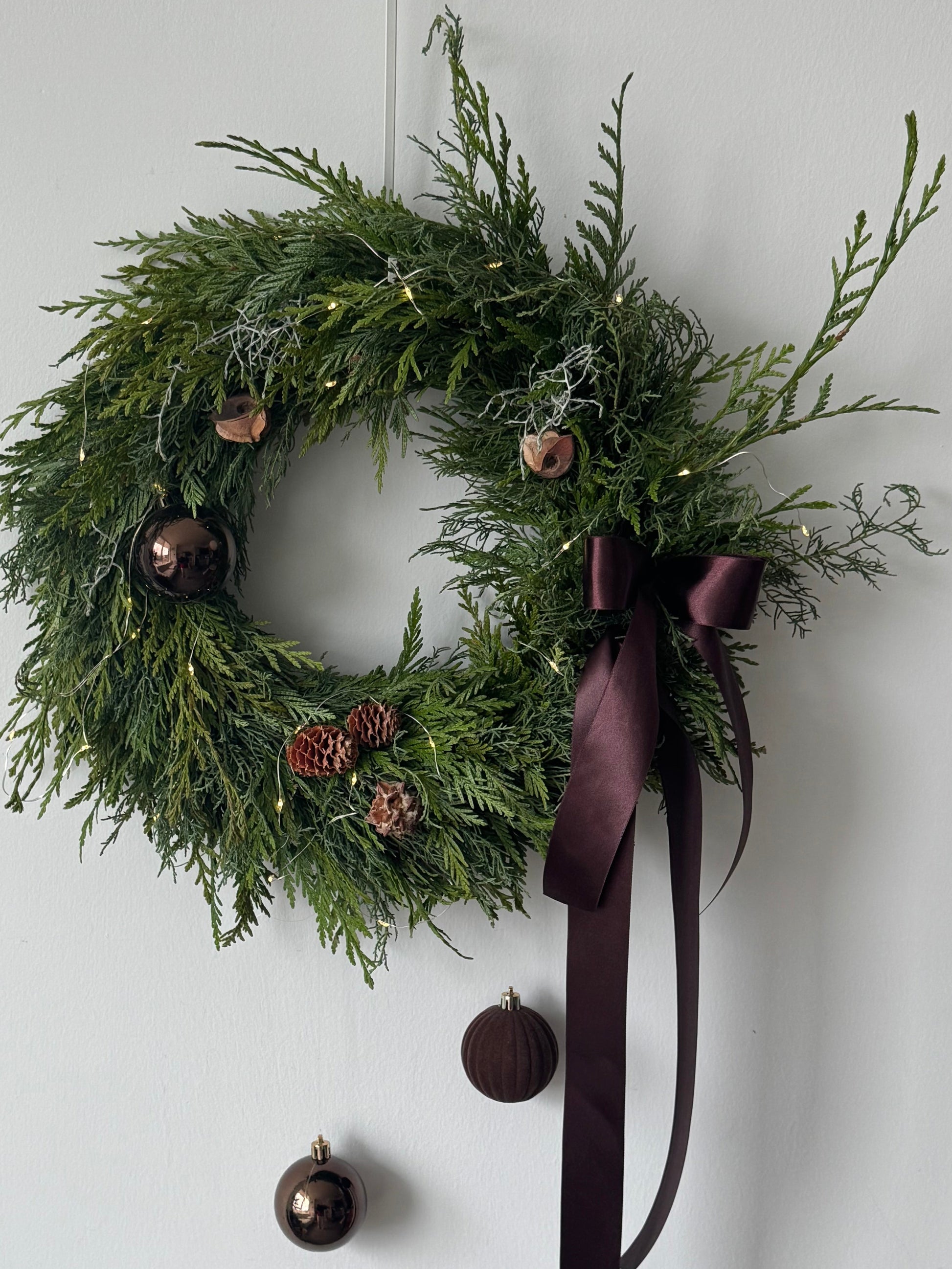 A modern holiday wreath crafted with lush cedar greenery, finished with deep cocoa-toned ribbon and subtle ornament details. Soft lights are available as an optional add-on for an enhanced look.