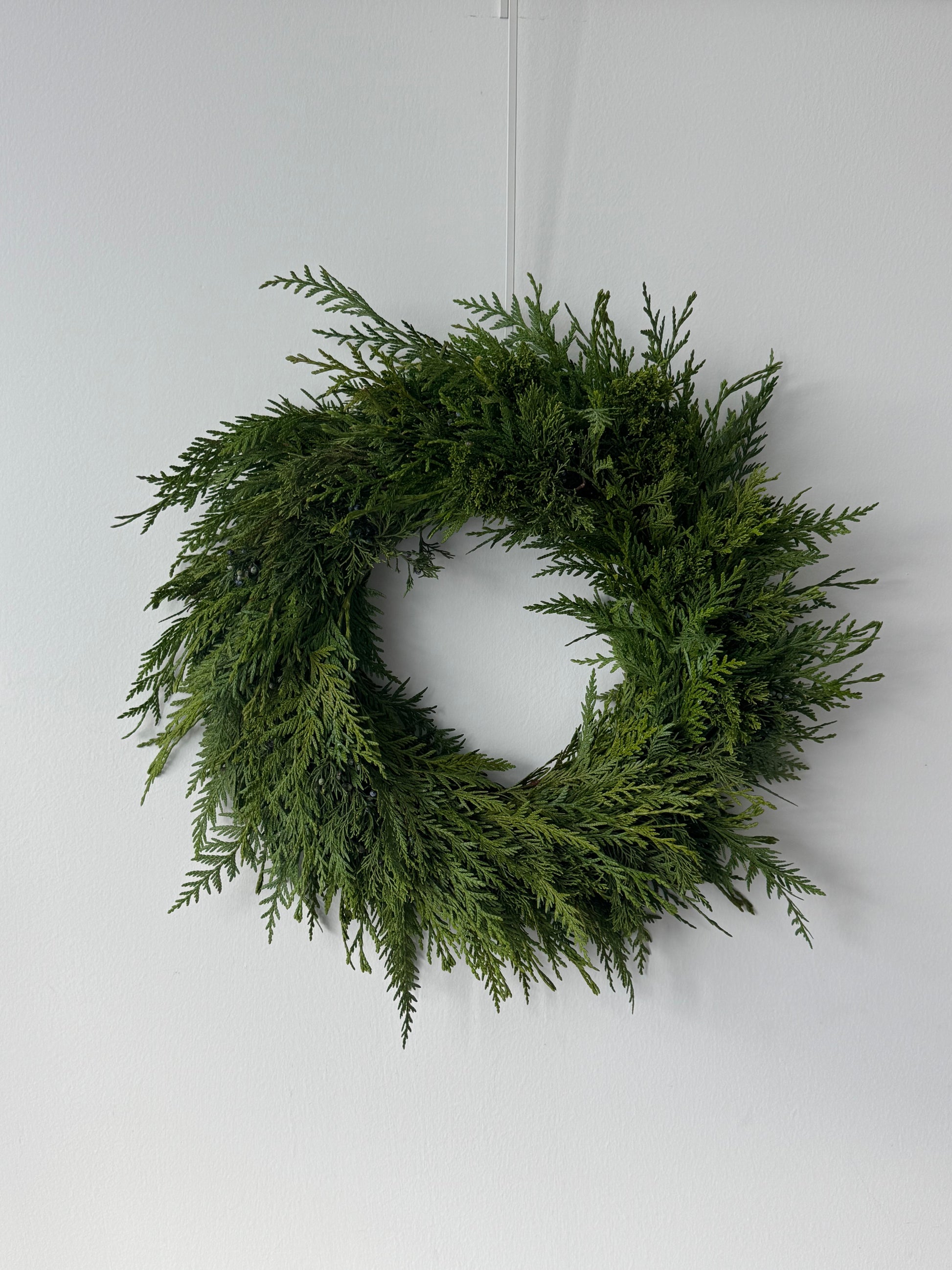 A minimal cedar wreath that highlights the natural beauty of fresh greenery. Brown natural ornament accents are available as an optional add-on for a warmer, more organic festive touch.