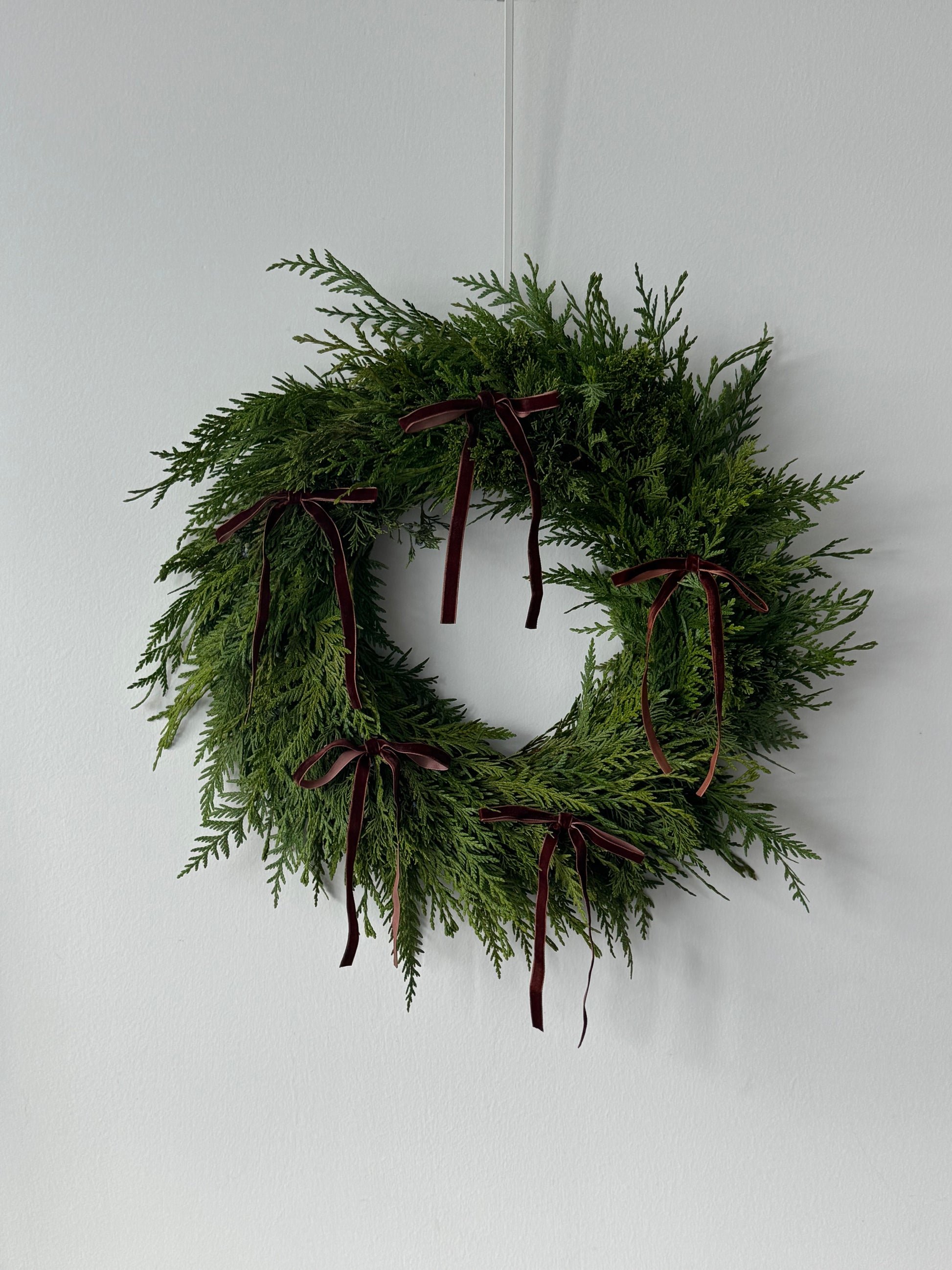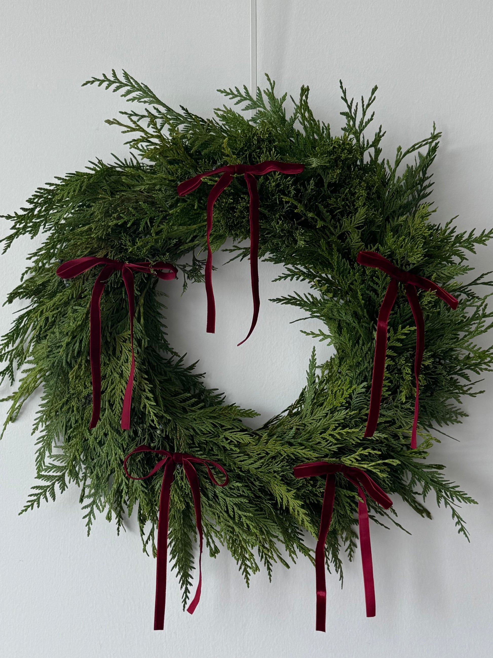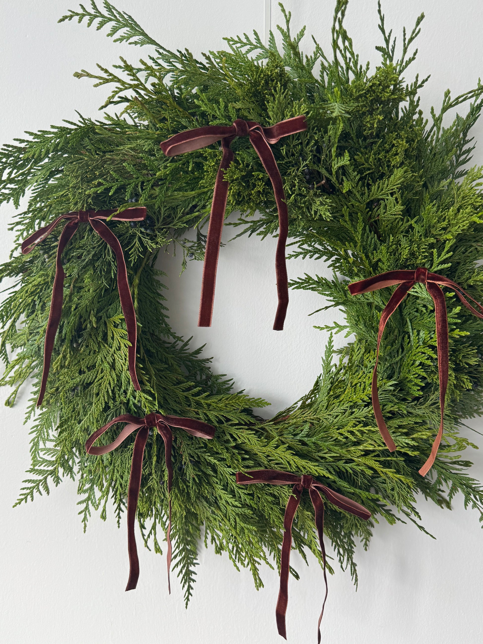 A modern holiday wreath crafted with fresh cedar greenery and finished with delicate mini velvet ribbons. Choose your preferred ribbon color from the available options.