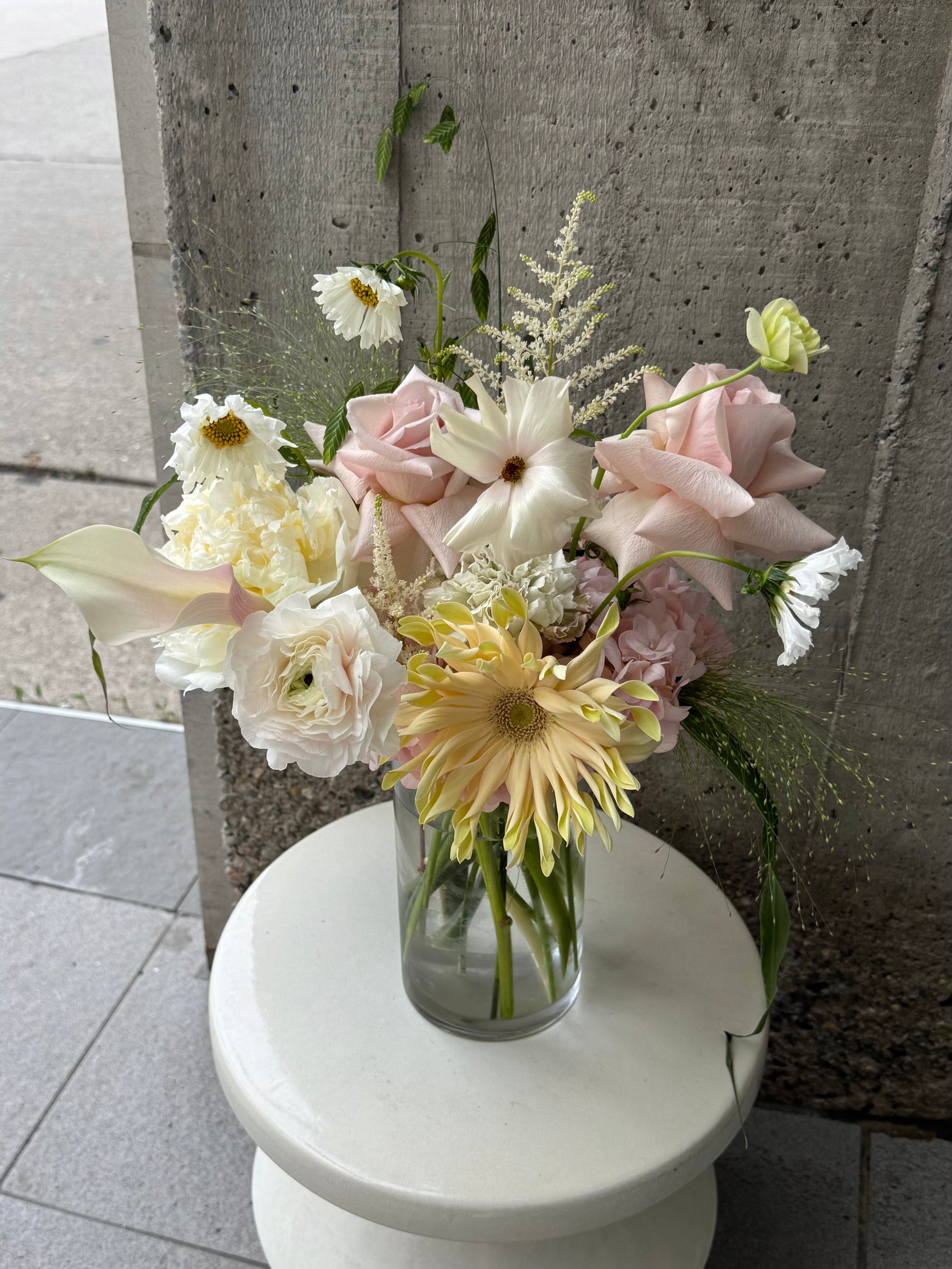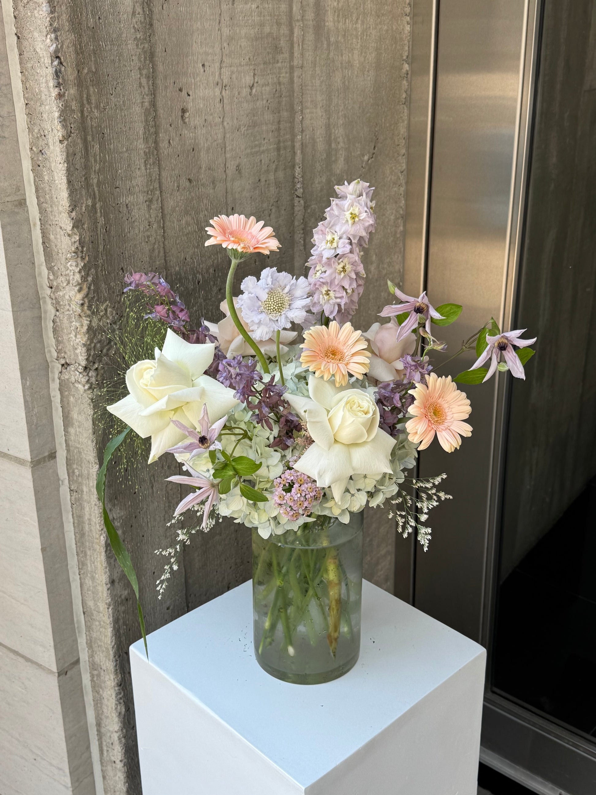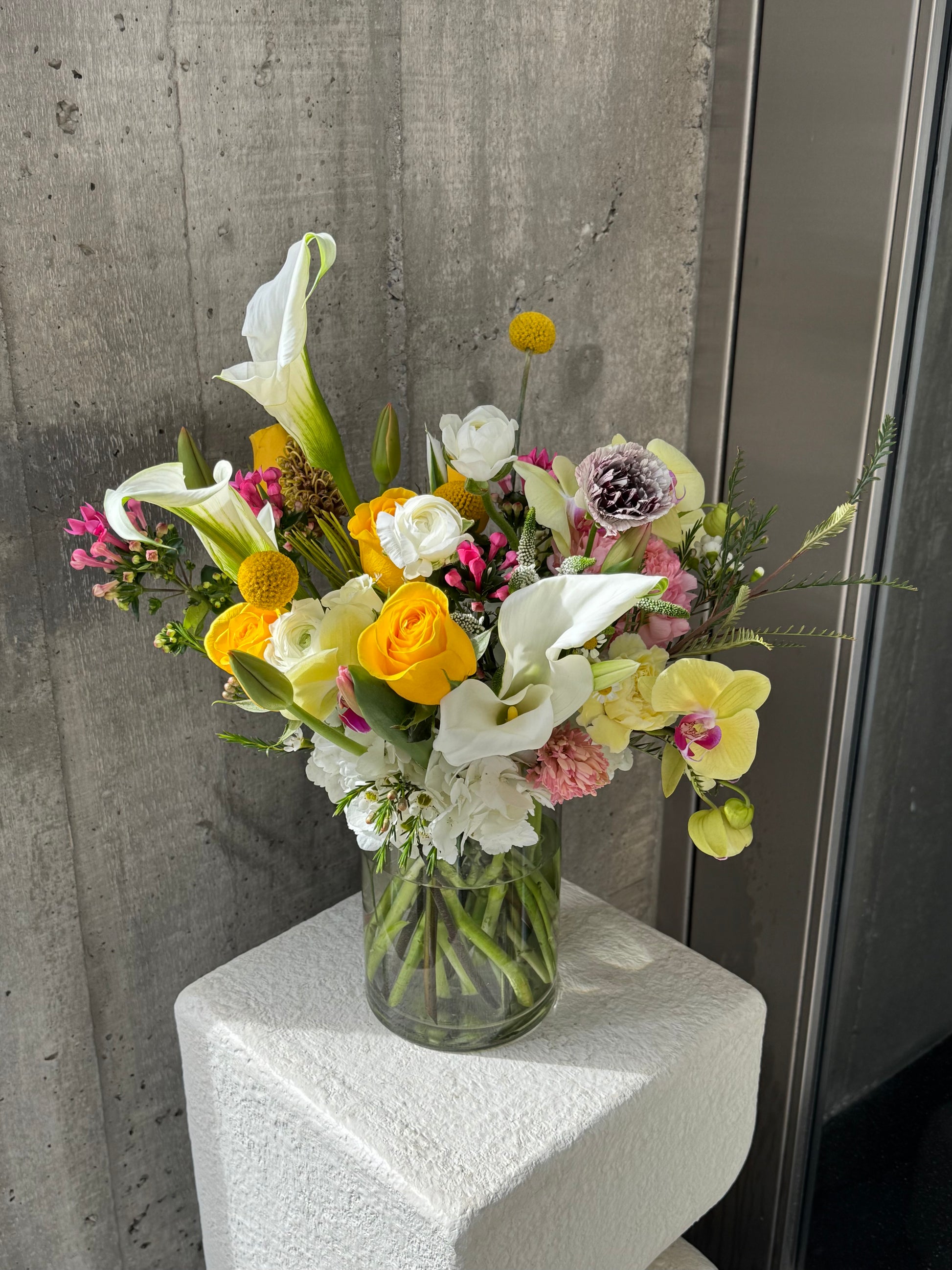 The clean lines of the cylinder vase highlight the beauty of seasonal flowers, creating a minimalist look that emphasizes their stems, petals, and colors. Depending on the time of year, the arrangement can reflect vibrant, lively blooms in spring and summer or soft, serene hues in fall and winter. Cylinder vase arrangements with seasonal flowers are versatile and perfect for home décor, weddings, events, or as a stylish centerpiece for any occasion.
