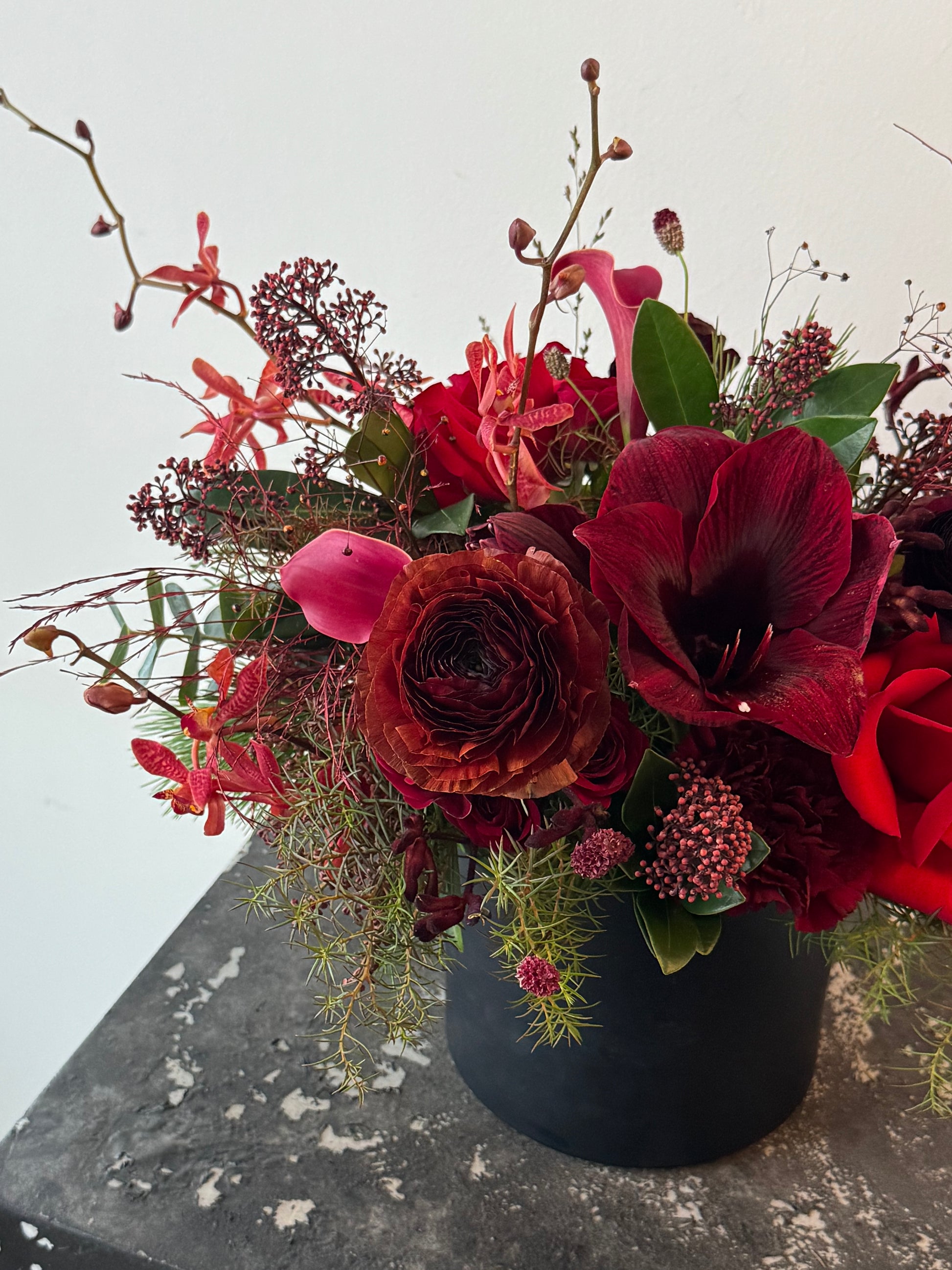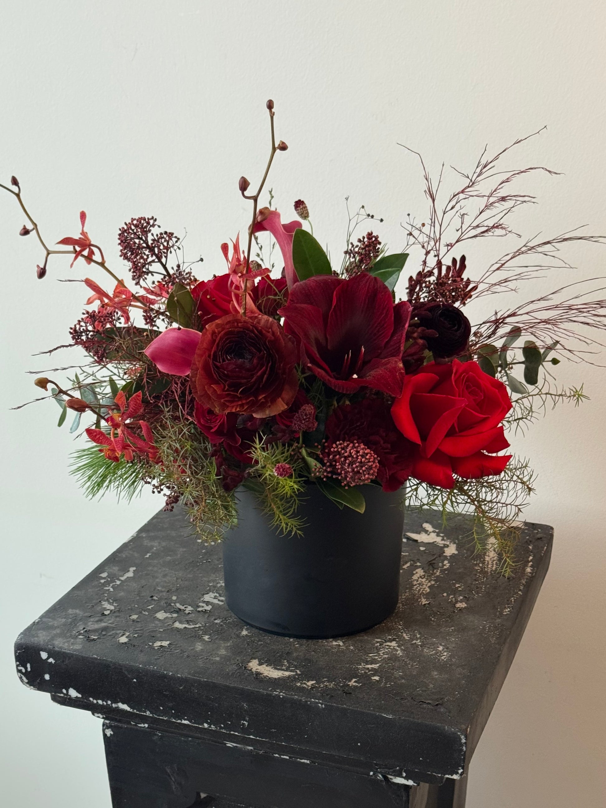 A moody winter arrangement featuring layered seasonal blooms and textural foliage, designed in deep, rich tones. Styled in a matte black vessel, this piece feels quiet, sculptural, and refined — perfect for intimate spaces and winter evenings.