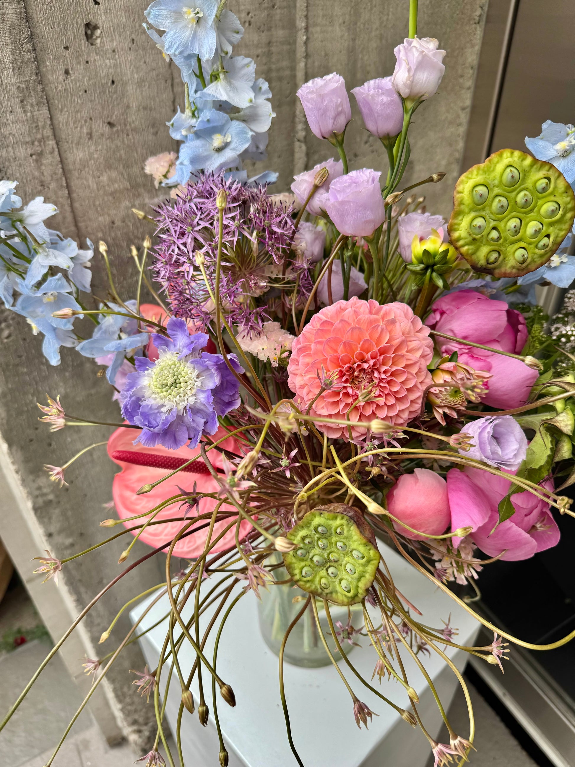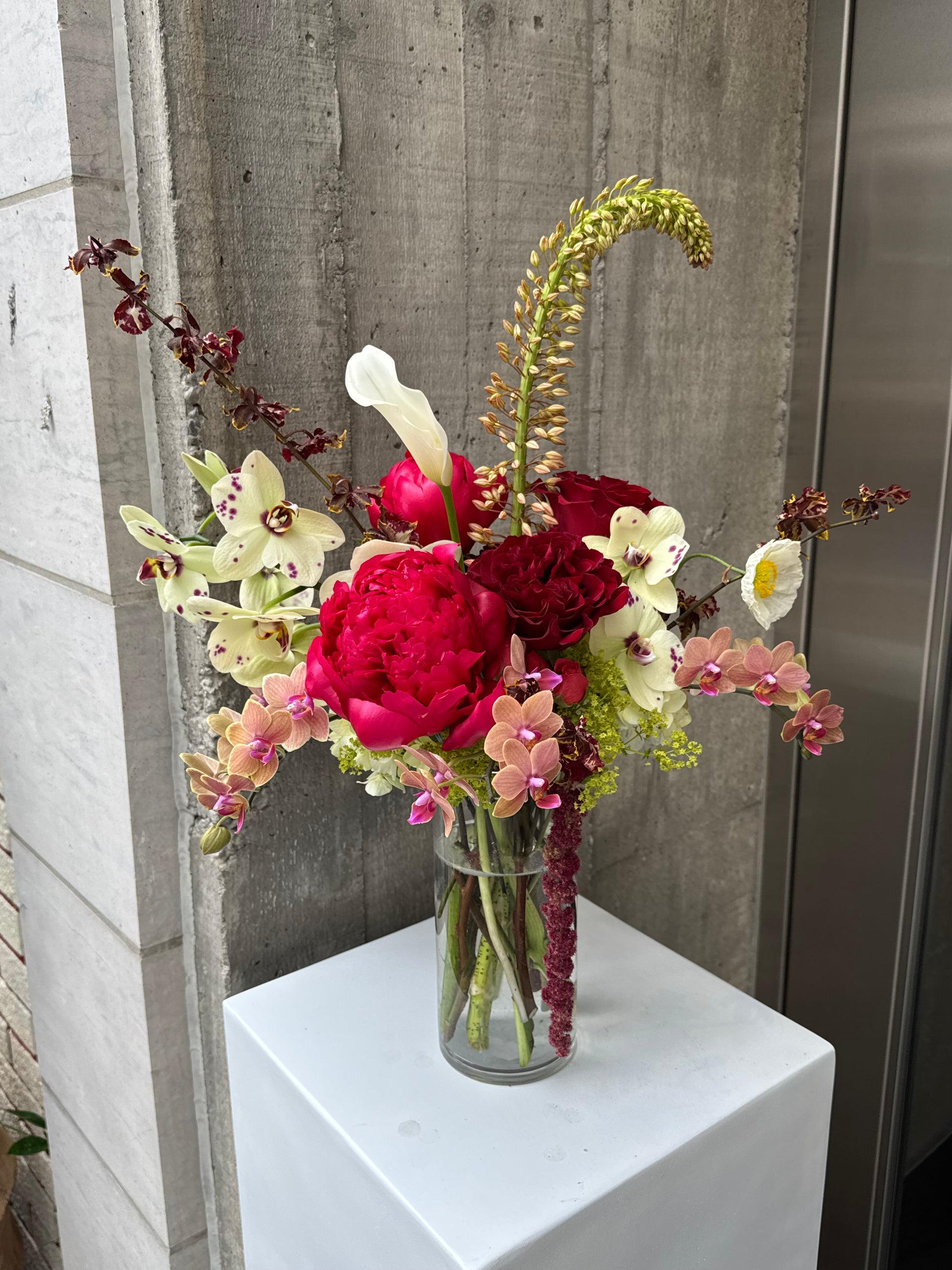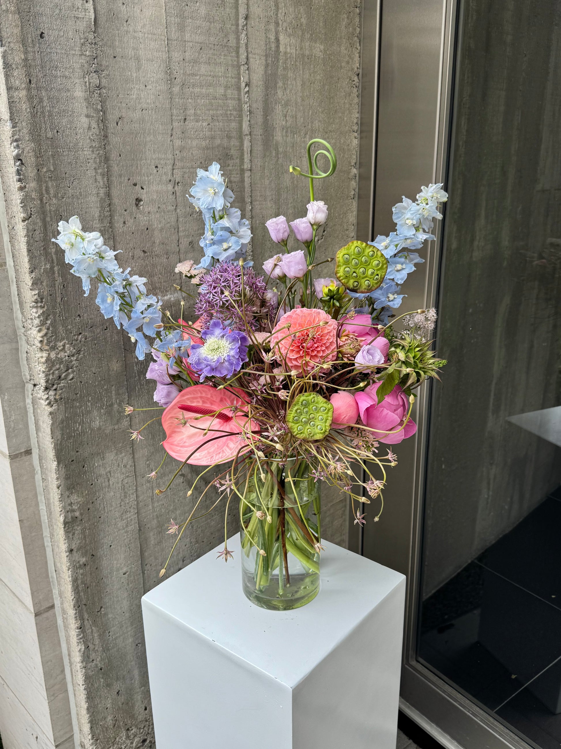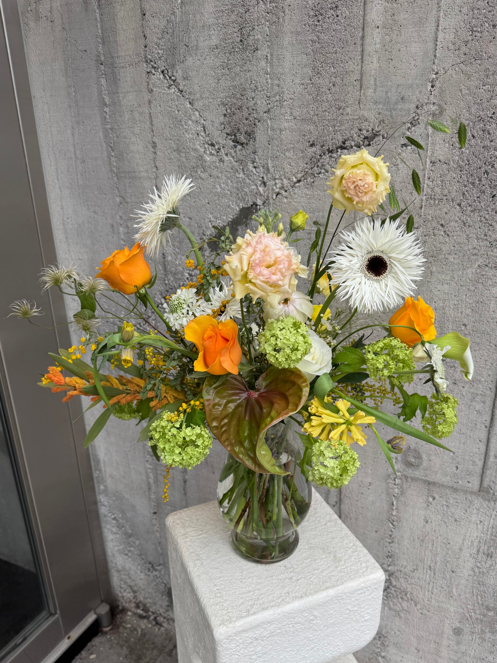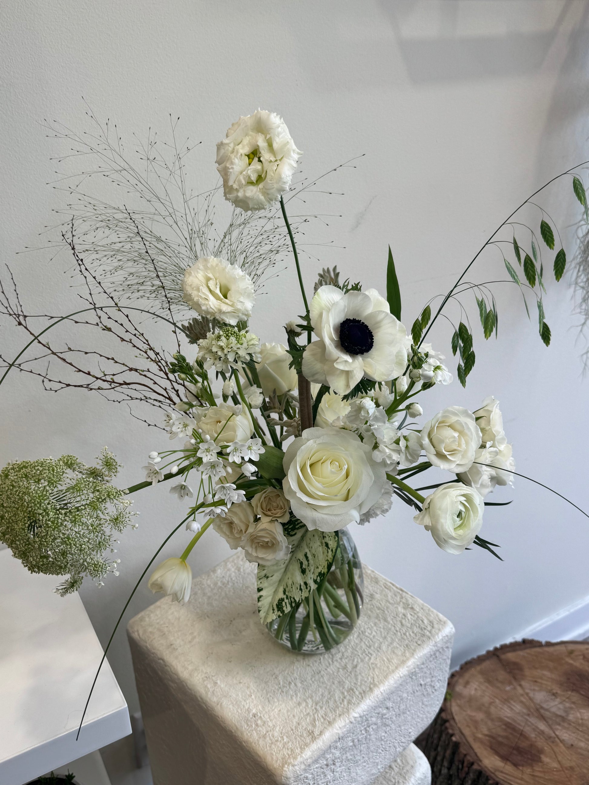 This wild-style clear vase arrangement feels effortlessly free-flowing, with wild textures and gentle movement. Seasonal flowers add a touch of freshness, while the clear vase keeps everything light and airy, letting the blooms shine in their purest form.