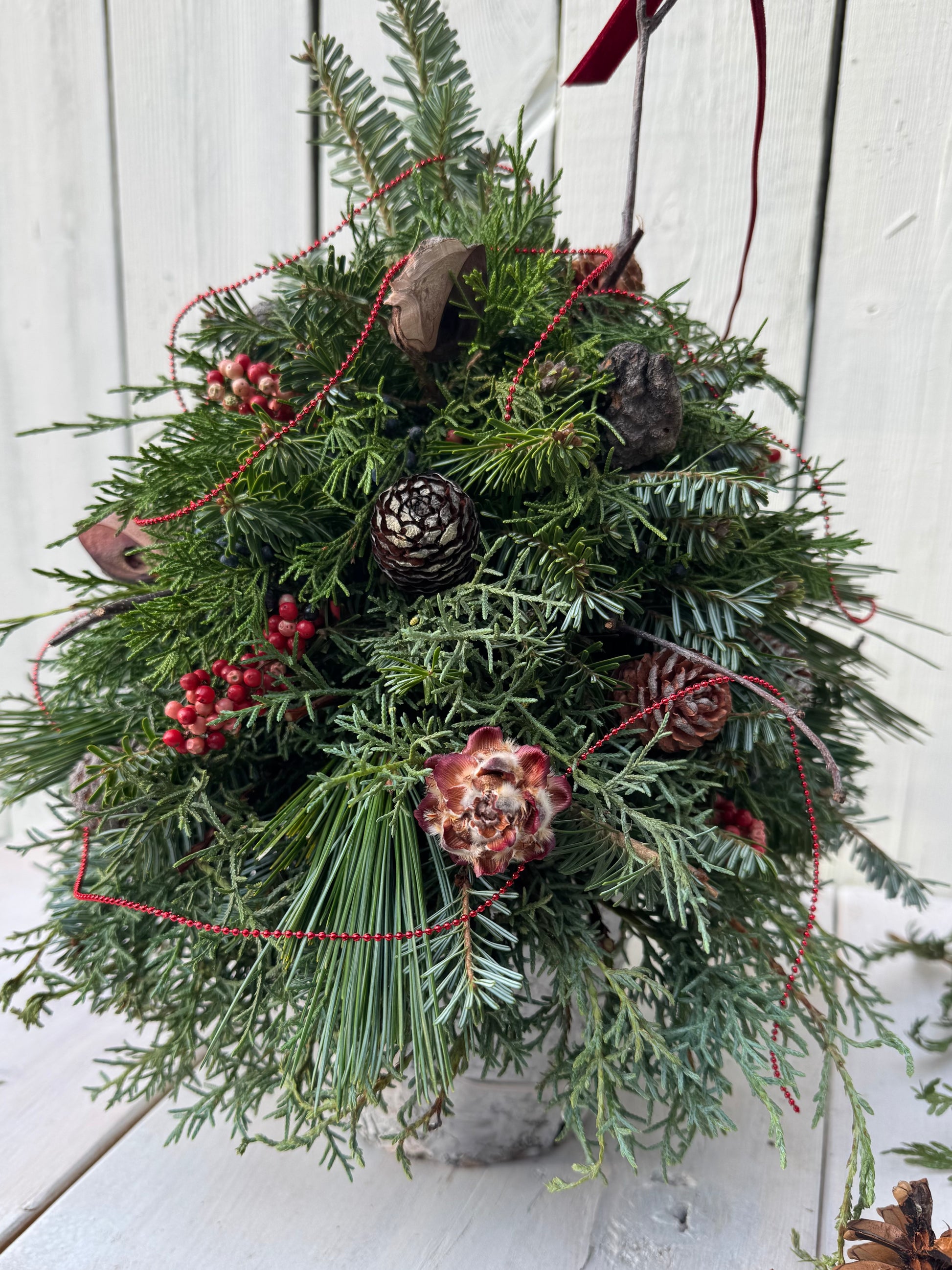 Mini handcrafted Christmas tree adorned with an assortment of fresh winter greens – the perfect gift for someone special!