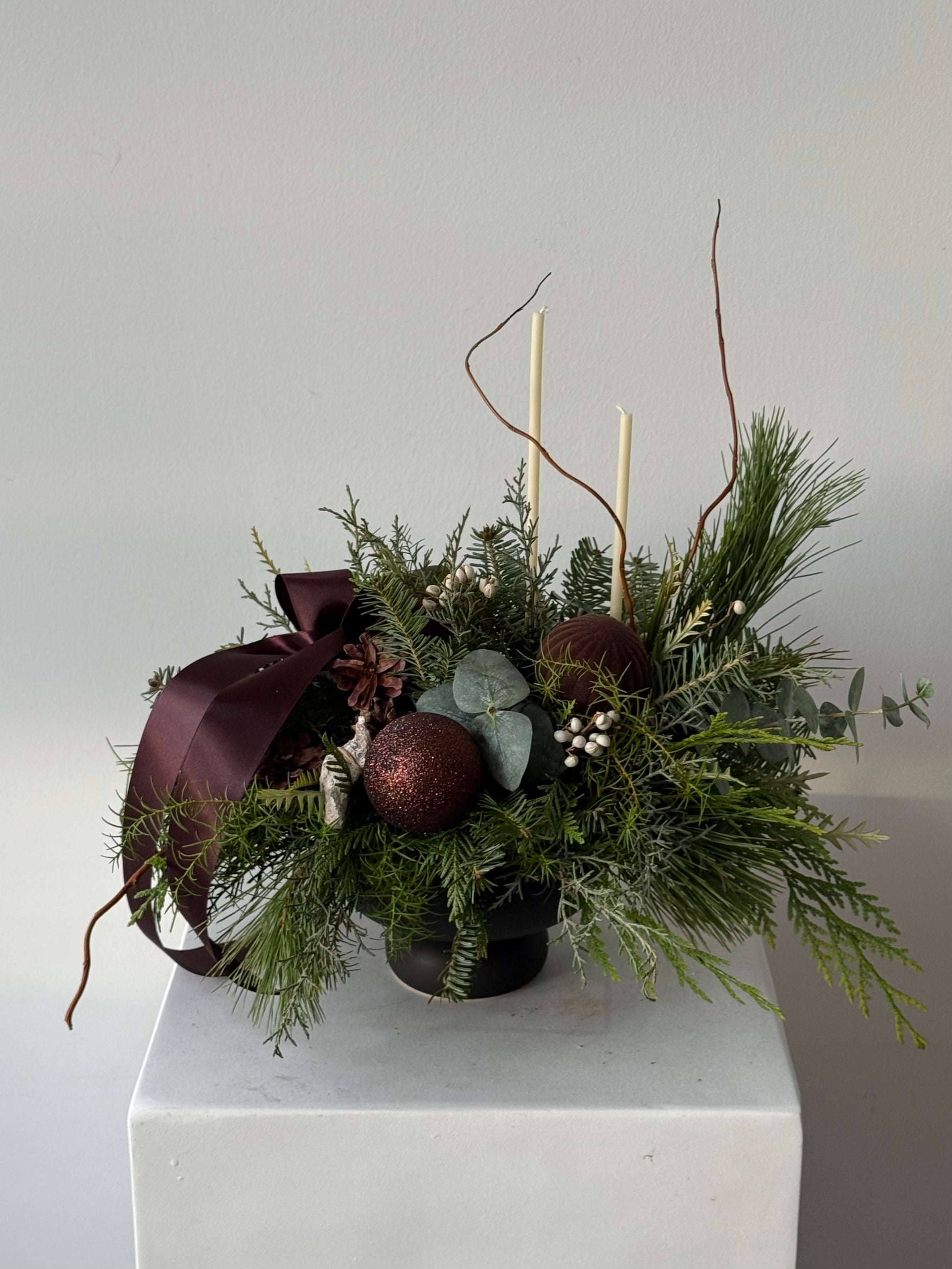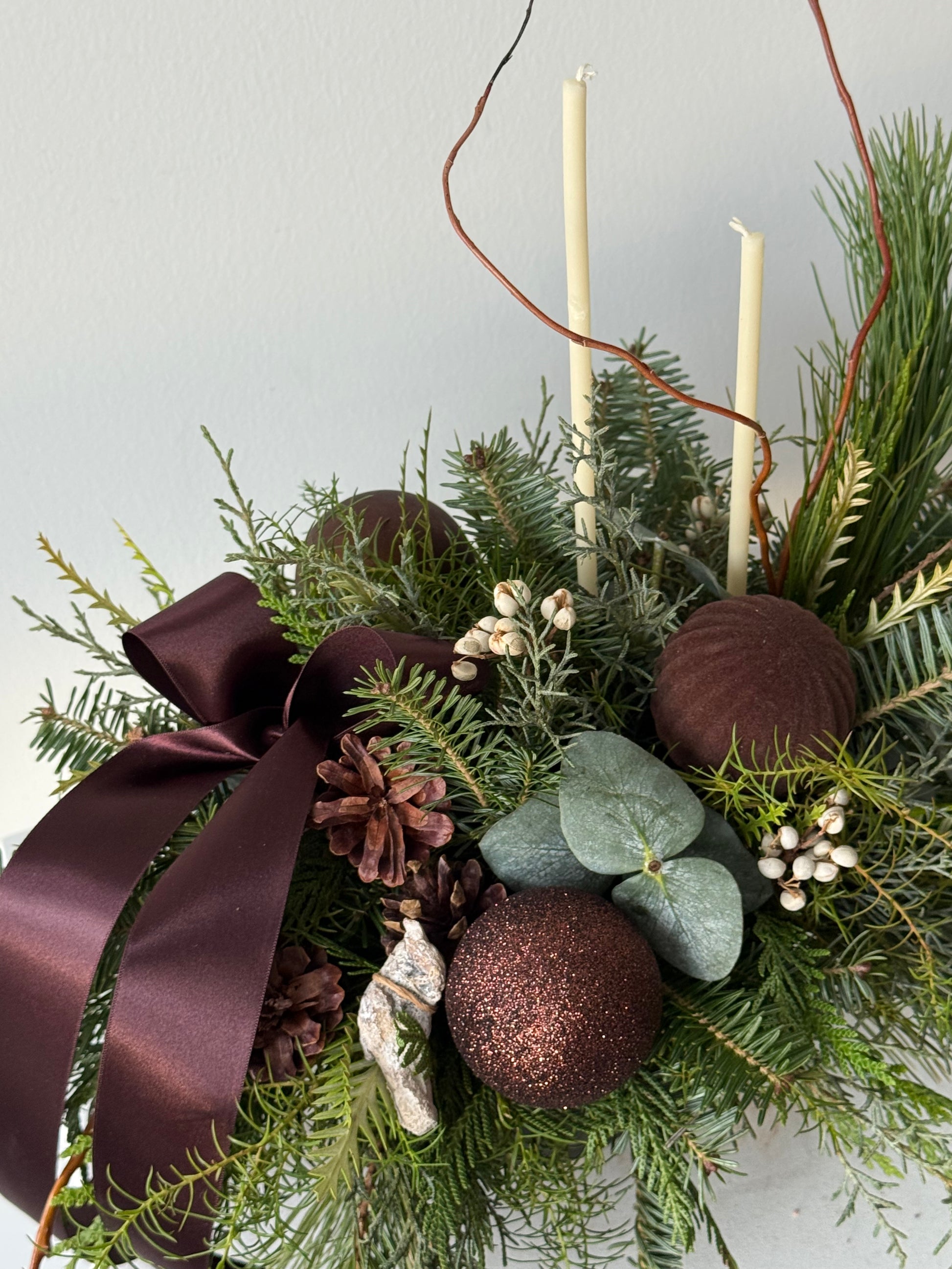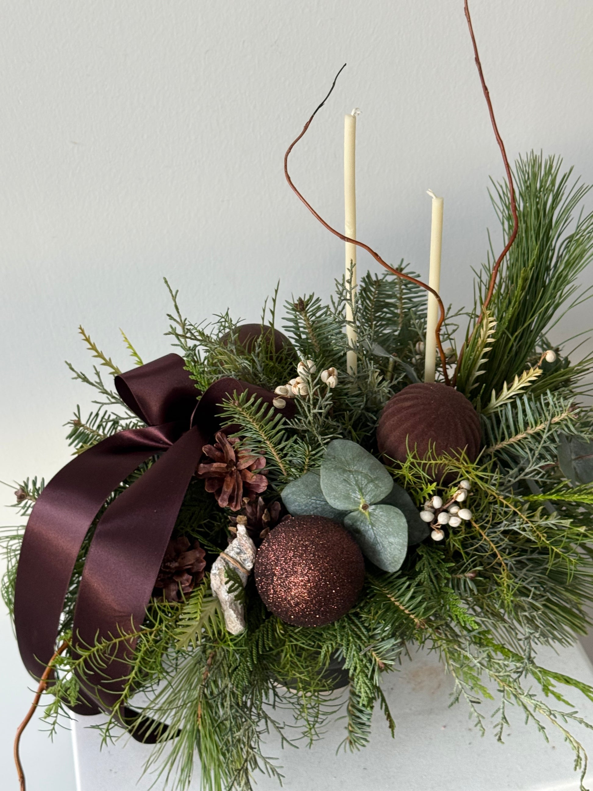 A long-lasting winter evergreen arrangement accented with a rich brown ribbon and natural seasonal textures.