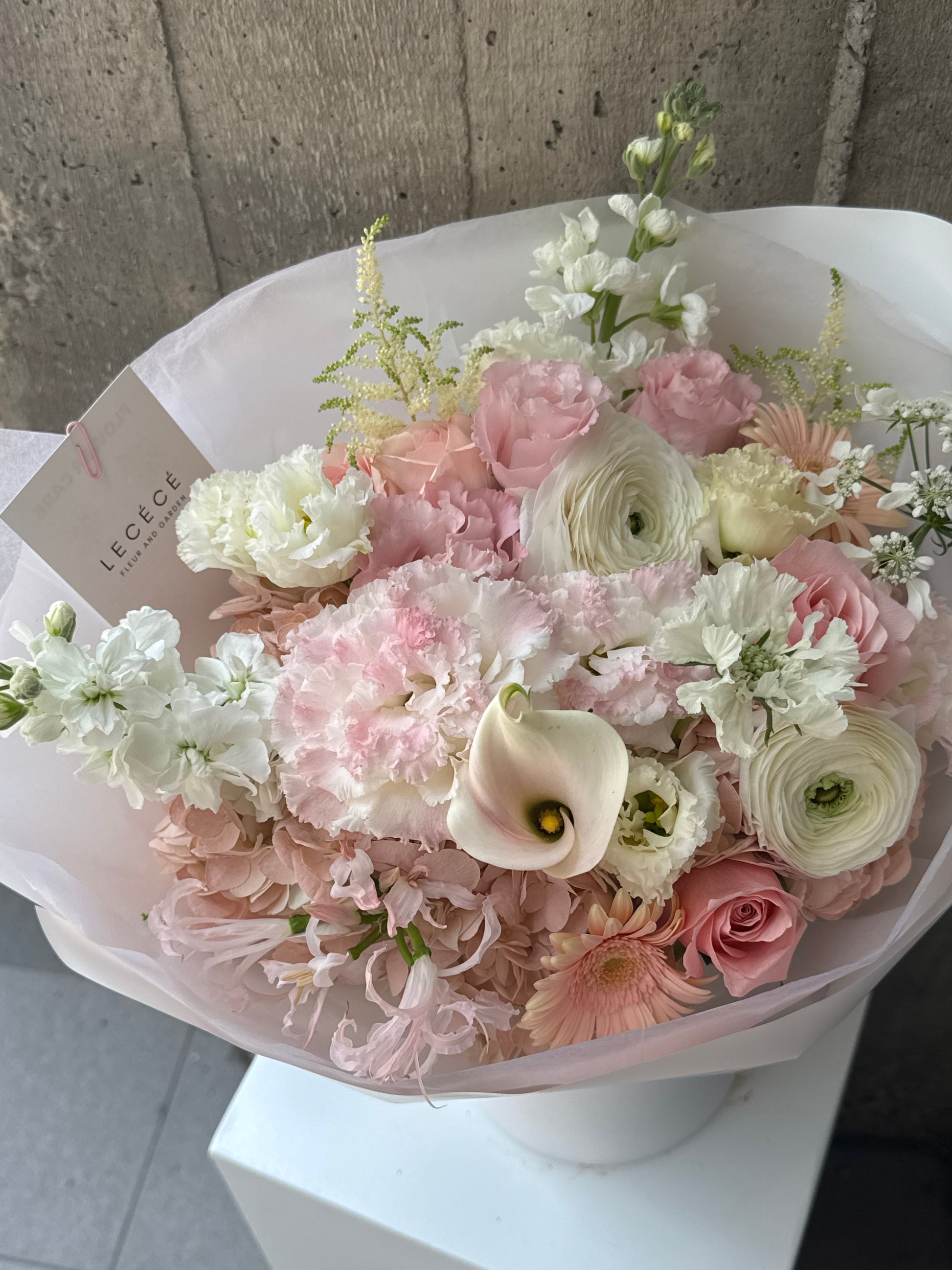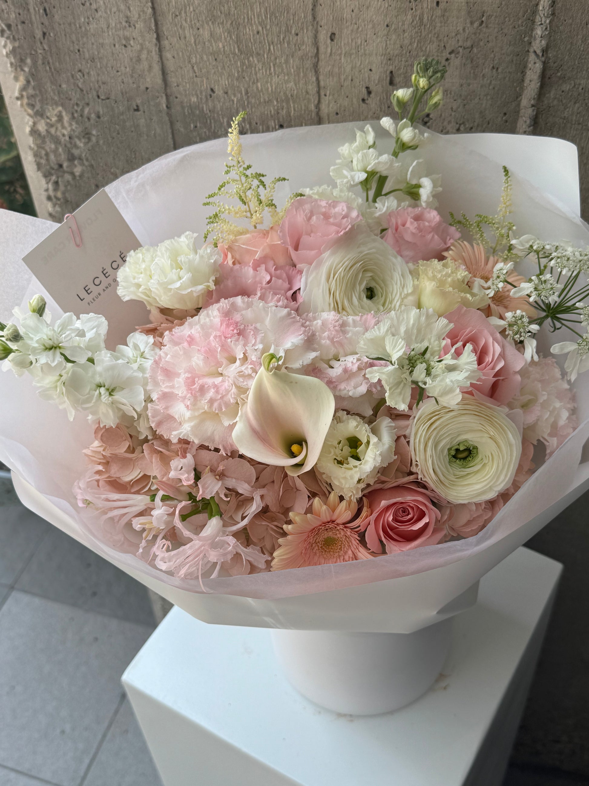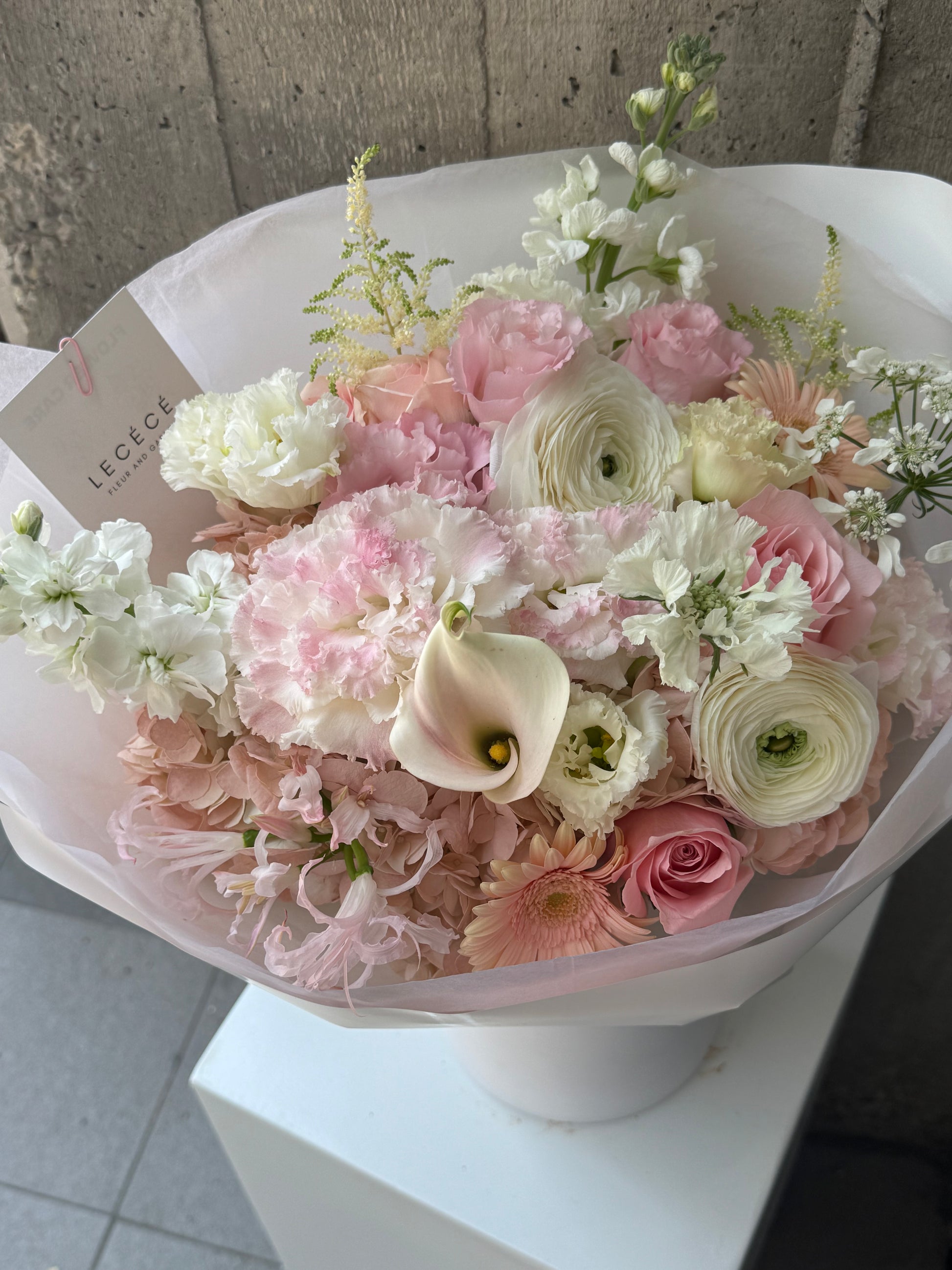 If there were such a thing as a pink cloud, we imagine it would feel just like this — a delicate blend of blush pink and soft white, thoughtfully arranged with seasonal blooms.