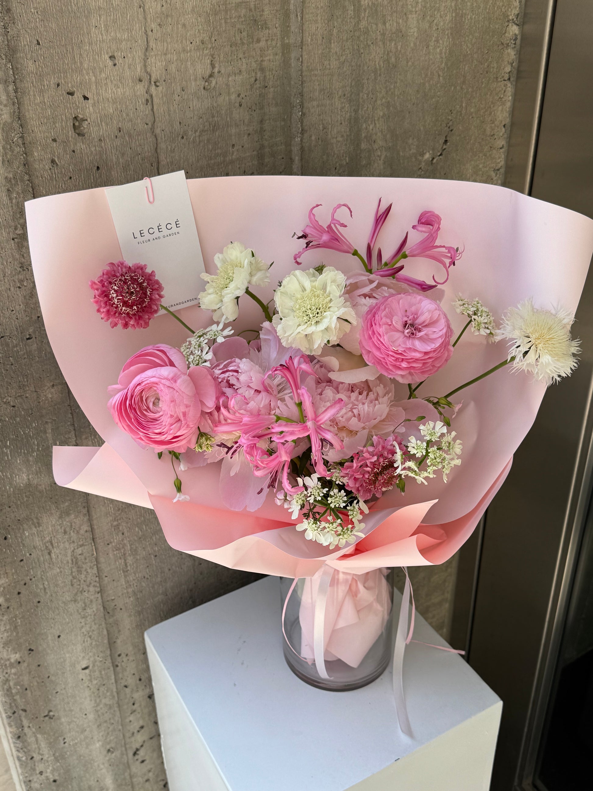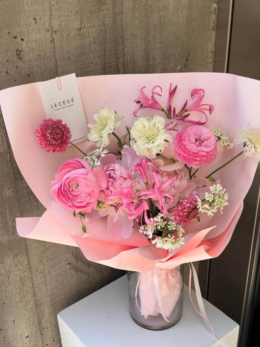 A soft, dreamy bouquet inspired by the sweet charm of a strawberry milkshake,