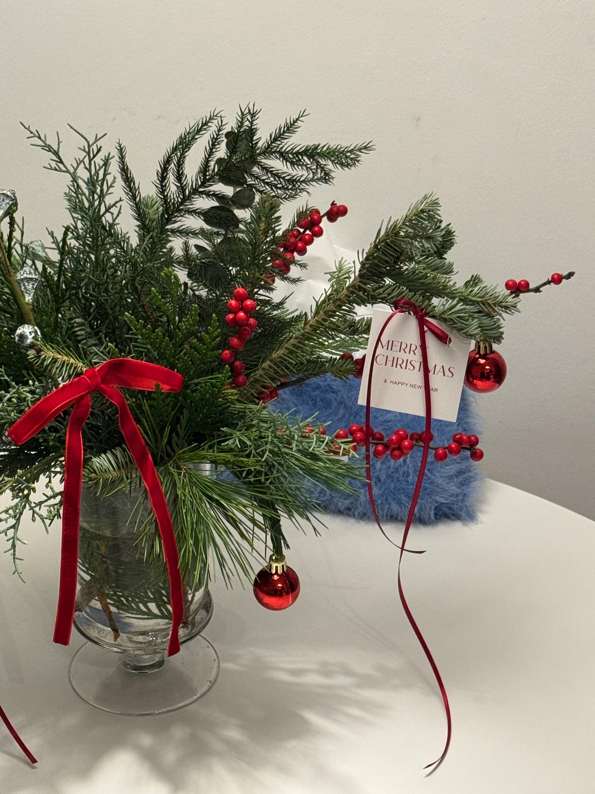 A long-lasting winter arrangement in an elegant goblet-shaped vase, filled with fresh seasonal greenery and a soft pine scent. Beautiful as a thoughtful gift or a charming centerpiece for holiday gatherings and festive tables.