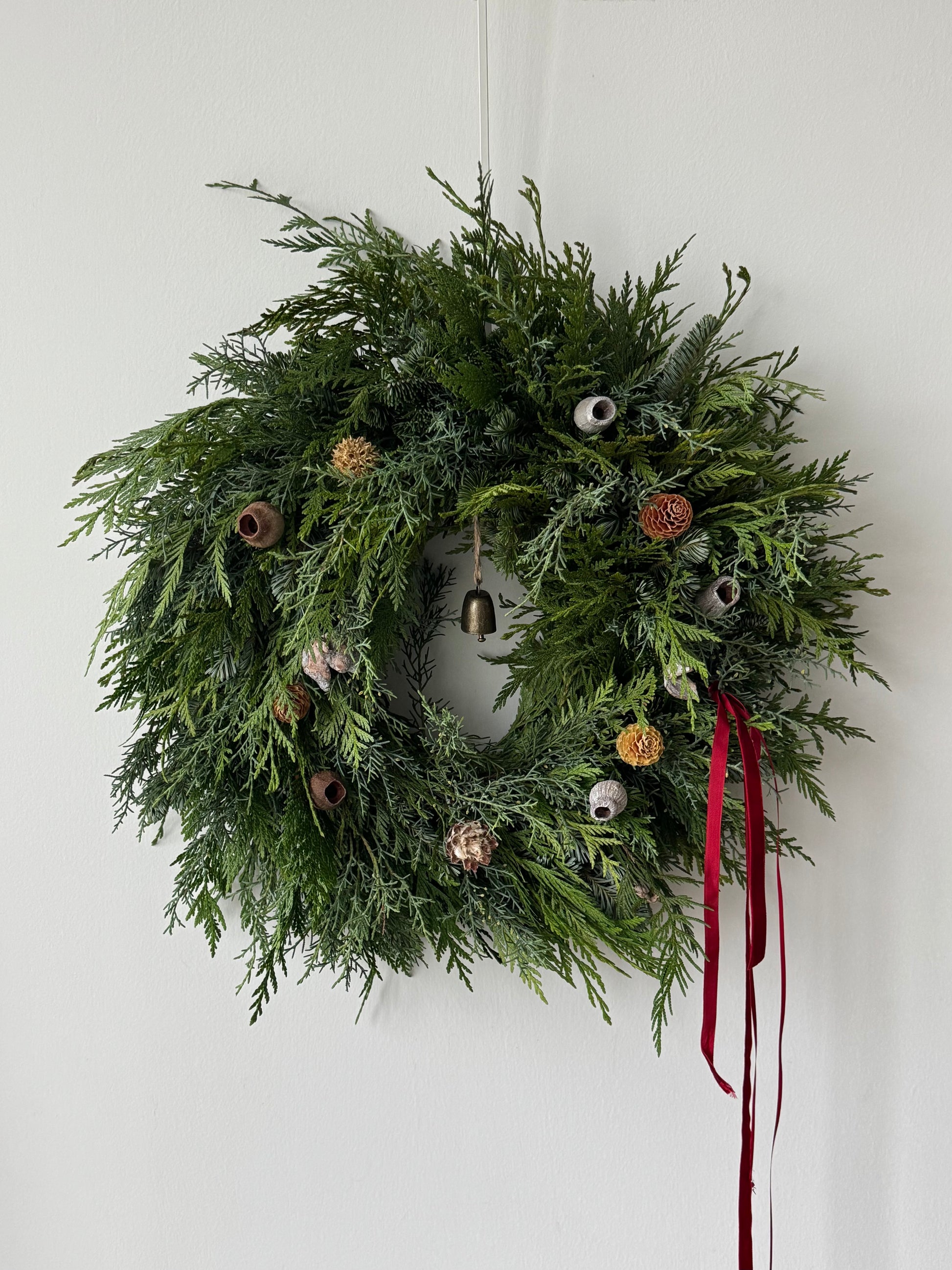 A natural evergreen wreath measuring approximately 16–18 inches, crafted with lush cedar and seasonal greenery, accented with pinecones, dried elements, and a subtle vintage bell. Finished with a flowing burgundy ribbon, it brings warm, rustic charm and a soft woodland atmosphere to any space.